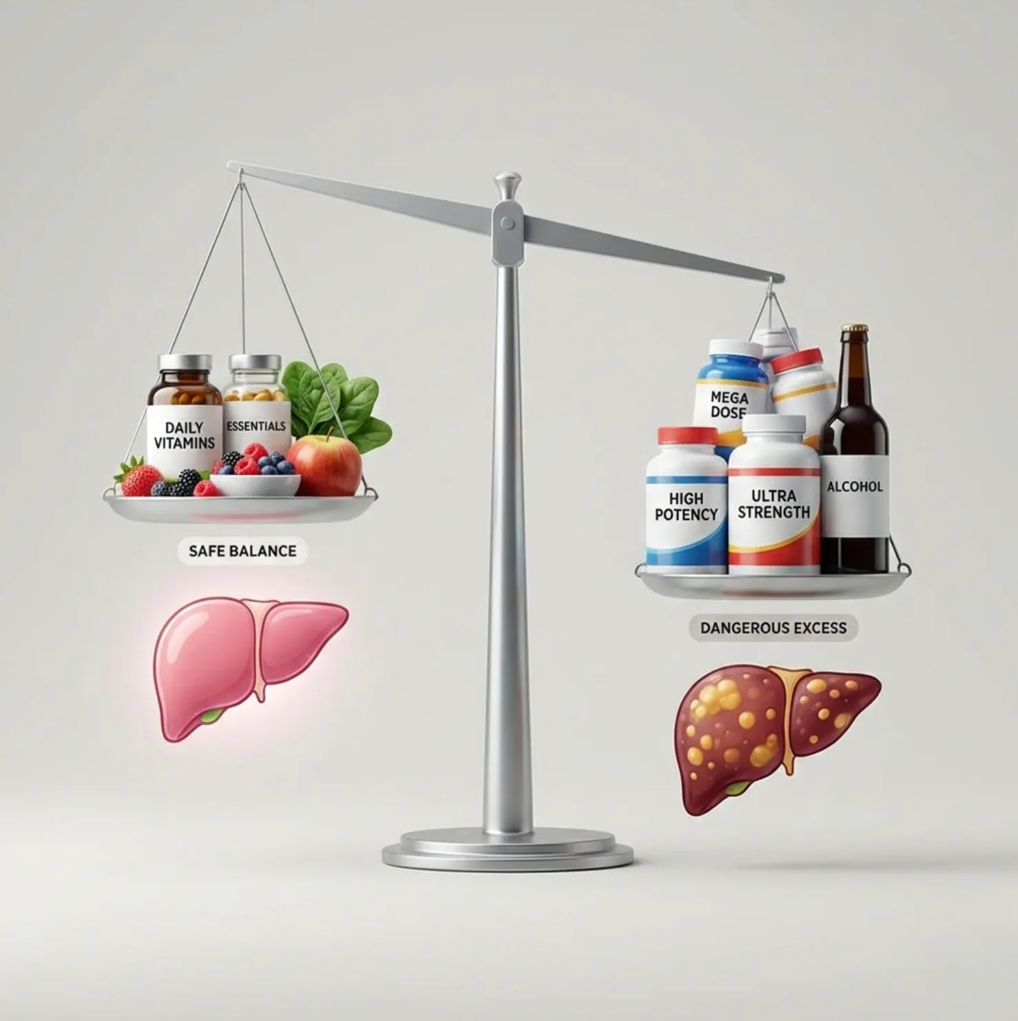 เมื่อเรากินวิตามินมากเกินไป โดยเฉพาะวิตามินที่ละลายในไขมัน ตับก็จะต้องทำงานหนักขึ้น เหมือนโรงงานที่ได้รับวัตถุดิบมากเกินกำลังการผลิต ในระยะสั้นอาจไม่มีปัญหา แต่ถ้าเป็นแบบนี้ต่อเนื่องเป็นเวลานาน เซลล์ตับก็อาจเสียหาย อักเสบ และในที่สุดอาจนำไปสู่ภาวะตับพิการได้